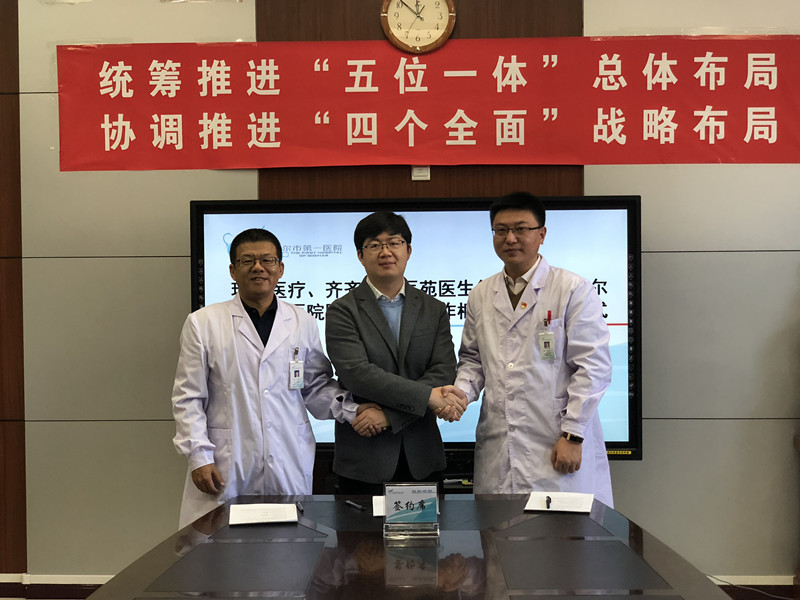 (Dr. Li Jing, superintendent of the First Hospital of Qiqihar, Dr. Li Huaming, General Manager of Universal Medical Hospital Digitalization Department and Dr. Yin Heliang, President of Yiyuan Doctor Group under the First Hospital of Qiqihar are attending the signing ceremony.)